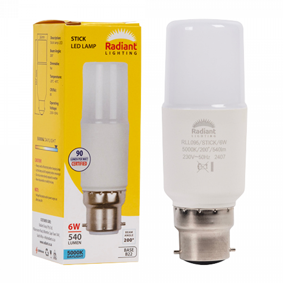 Compact and stylish 6W frosted stick LED lamp from Radiant, offering efficient lighting with a soft, diffused glow for everyday use.