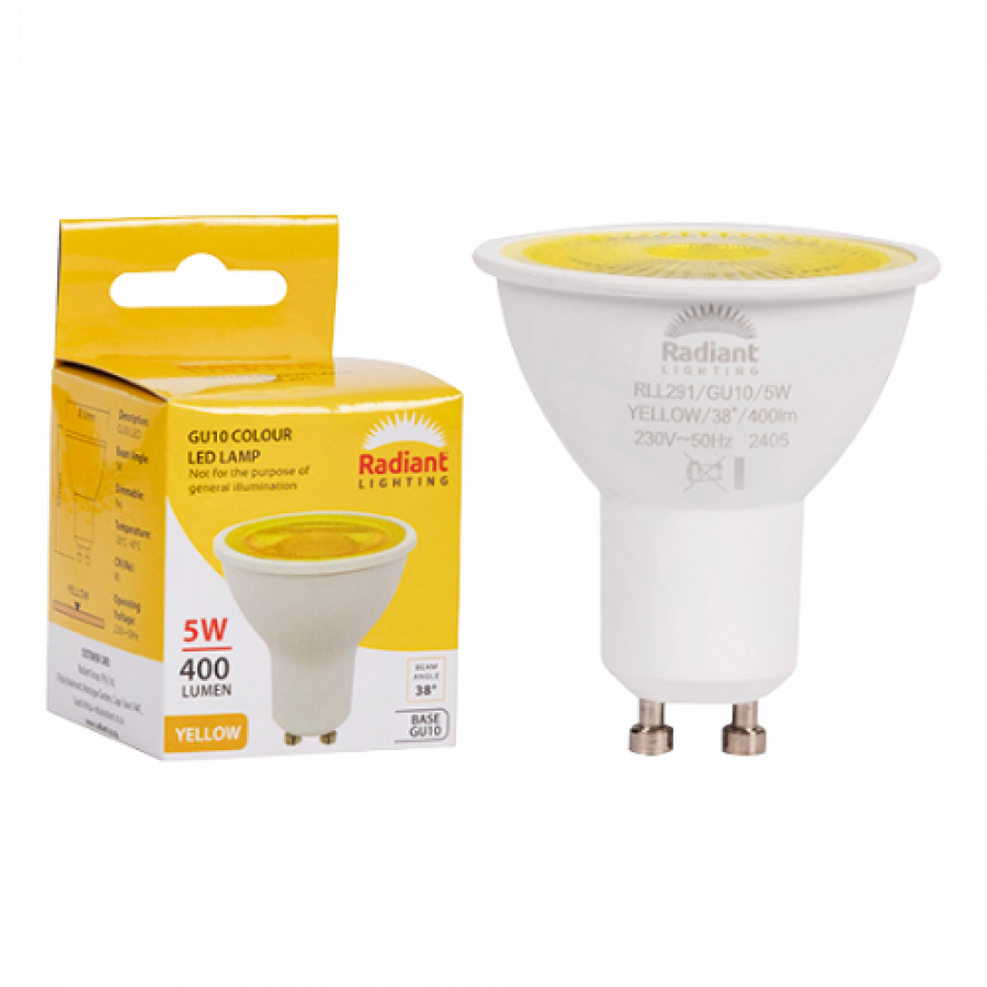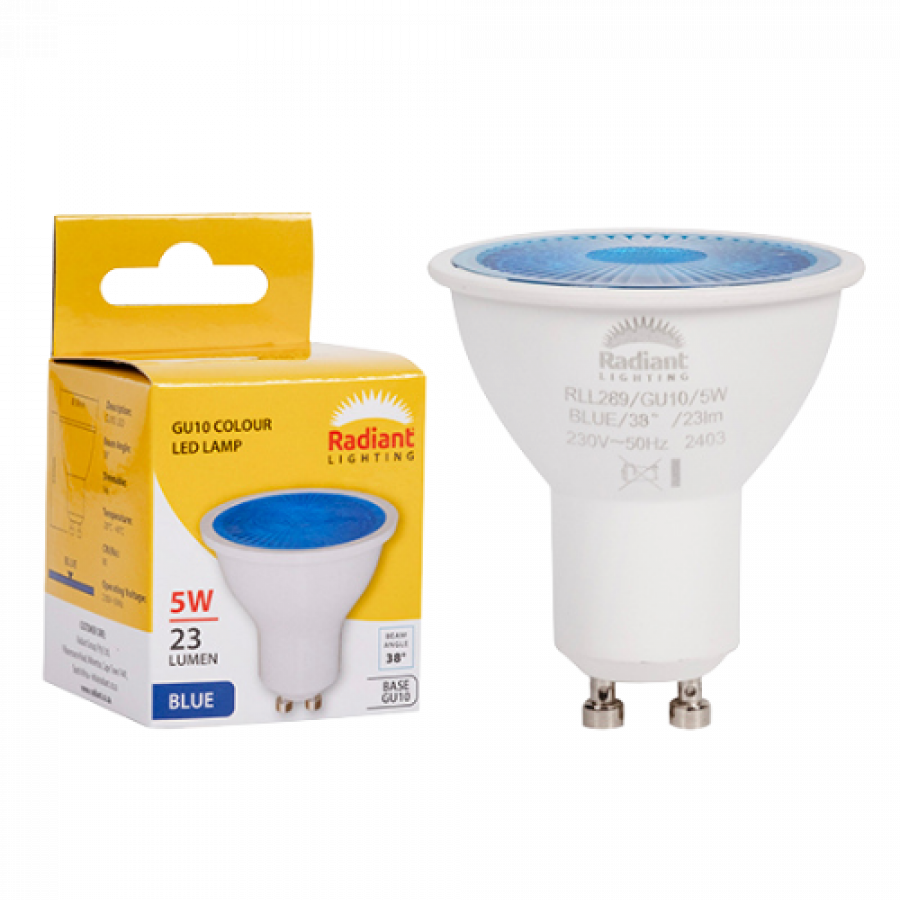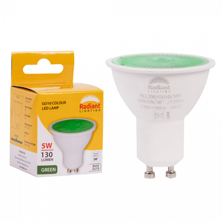 Radiant GU10 Coloured 5W LED lamp delivers vibrant decorative lighting. Perfect for mood settings, parties, and accent lighting with energy savings.